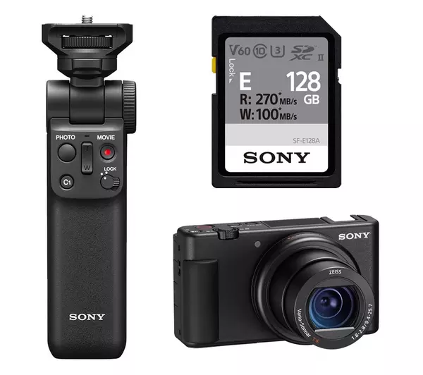 Home Cameras Cameras SONY ZV-1 High Performance Compact Vlogging Camera, GP-VPT2BT Shooting Grip & SD Card Bundle